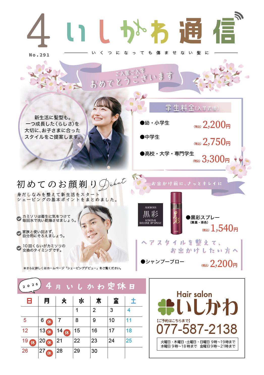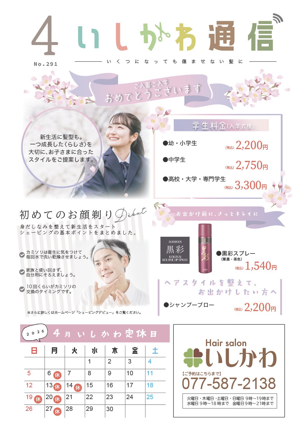 | 2025/4/1 | 5/8より、カラー料金を改定します。旧カラー回数券を終了します。)詳しくはクリックしてください。 |